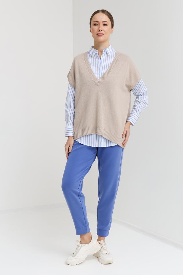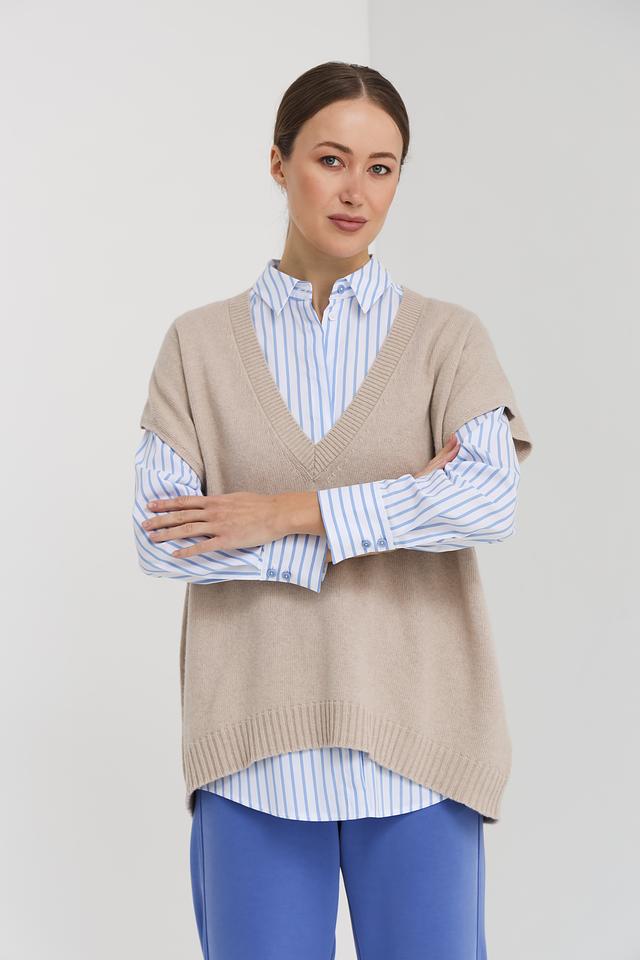 Жилет имеет V-образный вырез, который визуально удлиняет шею и делает силуэт более стройным. Свободный крой обеспечивает комфорт и свободу движений. Изготовлен из высококачественного трикотажа, в состав которого входит полиамид, шерсть, вискоза и кашемир, что гарантирует мягкость, тепло и долговечность изделия.