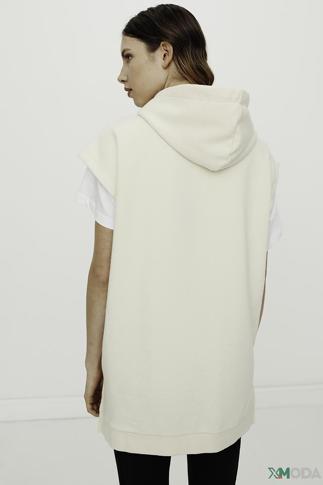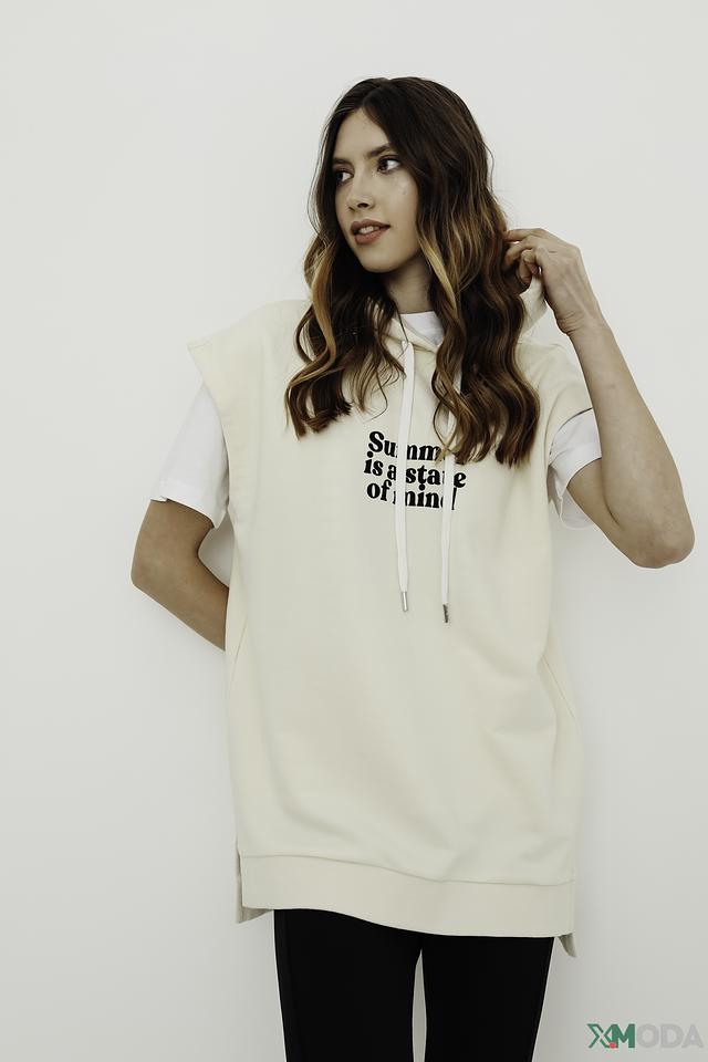 Бежевый жилет Marc Aurel свободного кроя с надписью "Summer is a state of mind". Модель выполнена из мягкого хлопка с добавлением полиэстера, имеет капюшон и удлиненный силуэт. Состав: хлопок 60%, полиэстер 40%