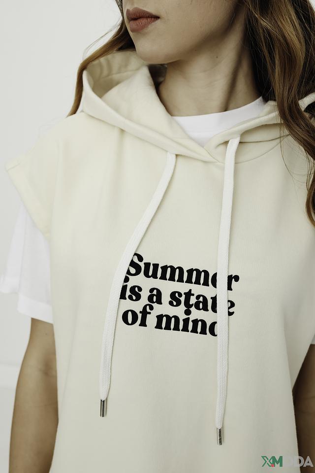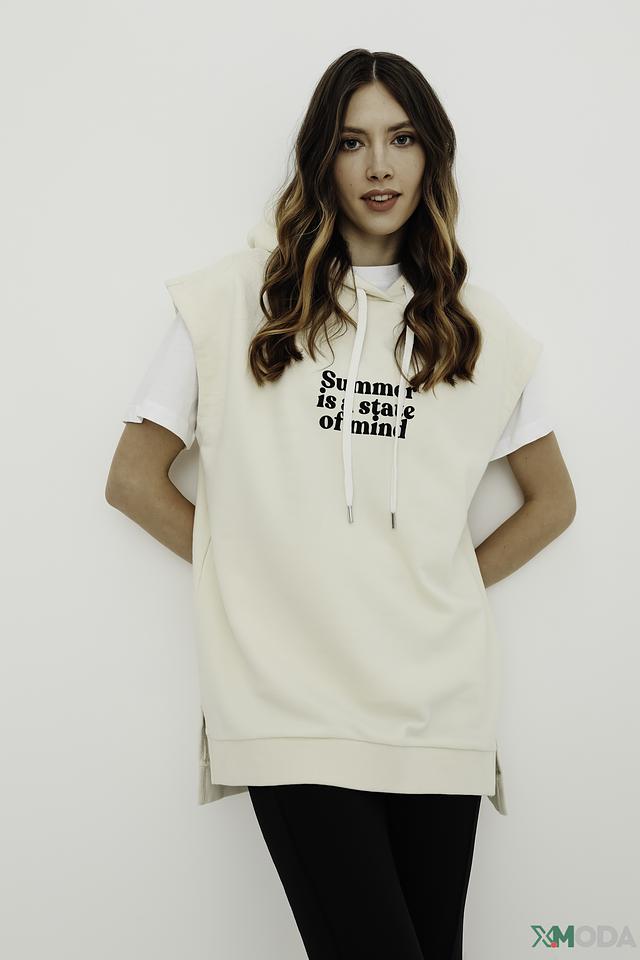 Жилет имеет свободный крой, который обеспечивает комфорт в носке, а удлиненный силуэт визуально вытягивает фигуру. На передней части изделия размещен яркий принт с надписью "Summer is a state of mind", который подчеркивает летнее настроение.