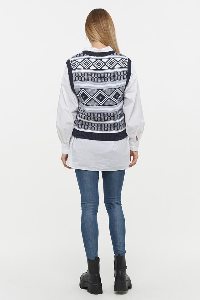 Этот жилет от VAY – отличный выбор для создания многослойных образов. Он выполнен в темно-синем цвете и украшен выразительным геометрическим узором, сочетающим в себе белый и серый оттенки.