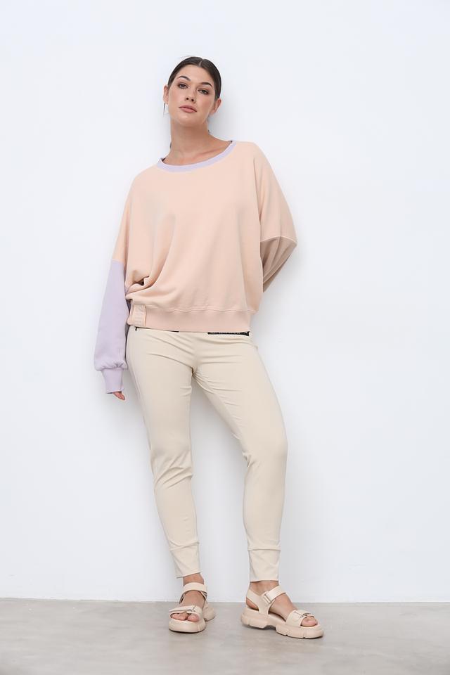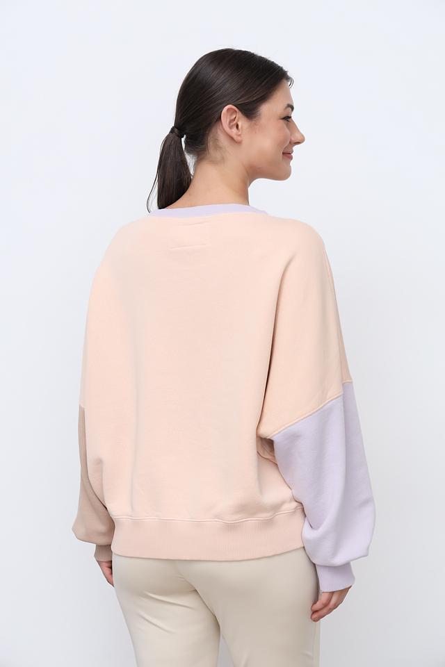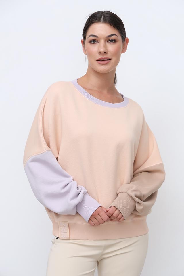 Персиковый пуловер Zhrill из 100% хлопка с контрастными лавандовыми рукавами и горловиной. Свободный крой и комфортный материал делают этот пуловер идеальным выбором для повседневного образа. Состав: хлопок 100%