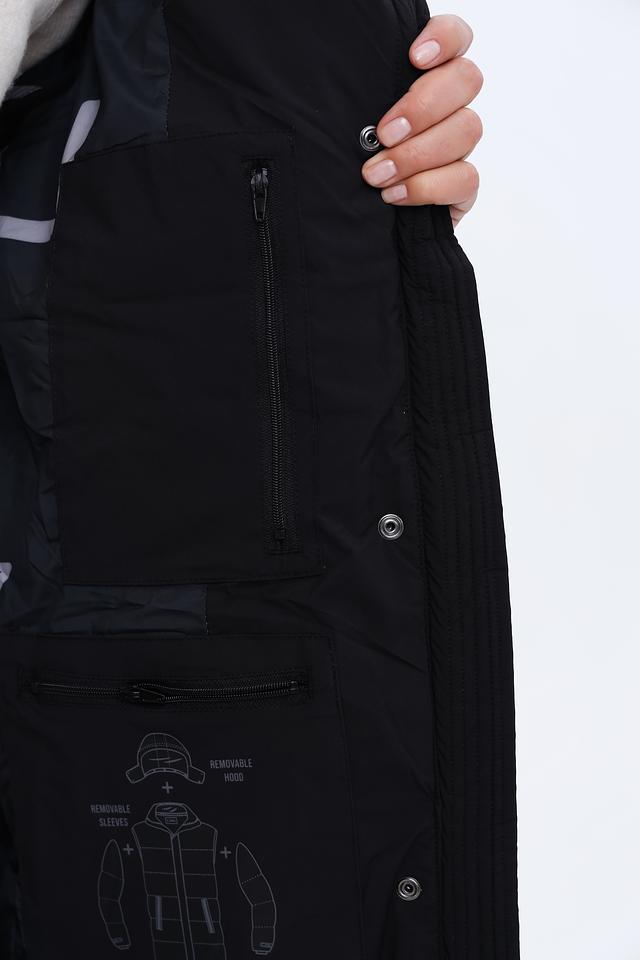 Это женское пальто от бренда Zhrill выполнено в классическом чёрном цвете и имеет длину до середины икры. Пальто имеет стеганую текстуру, которая придает ему современный вид и обеспечивает дополнительную теплоизоляцию.