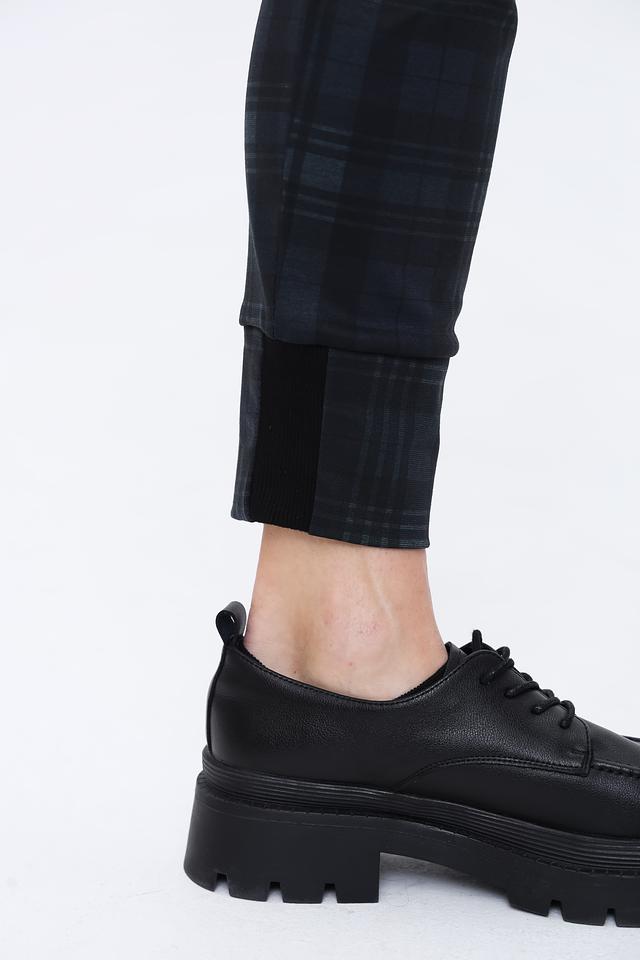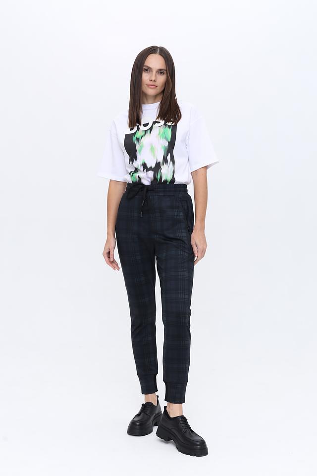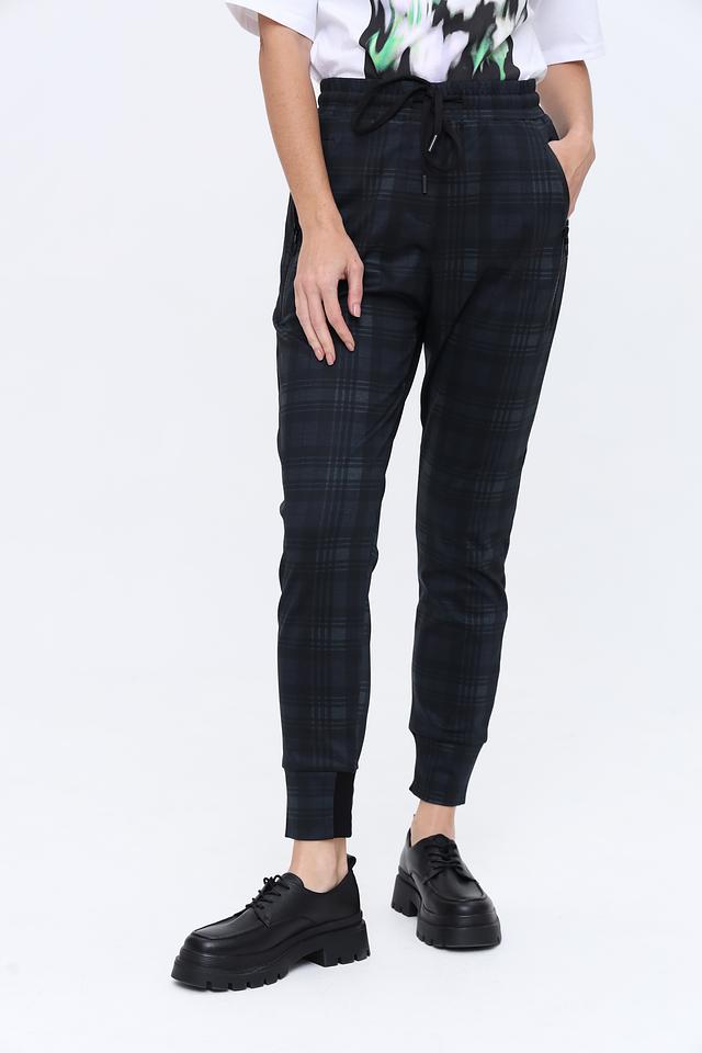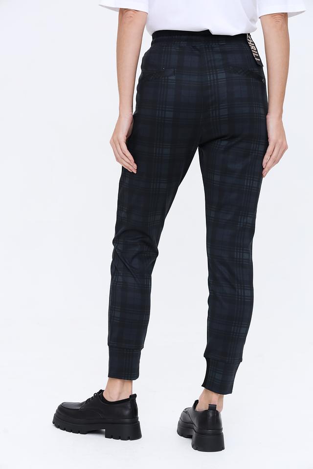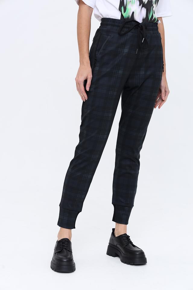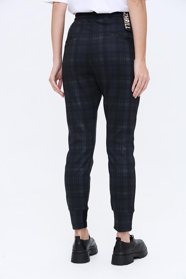 Женские брюки Zhrill в клетку тёмно-зелёного и чёрного цвета — удобная и стильная модель с эластичным поясом и манжетами. Идеальный выбор для создания повседневных образов. Состав: полиэстер 53%, вискоза 43%, эластан 4%