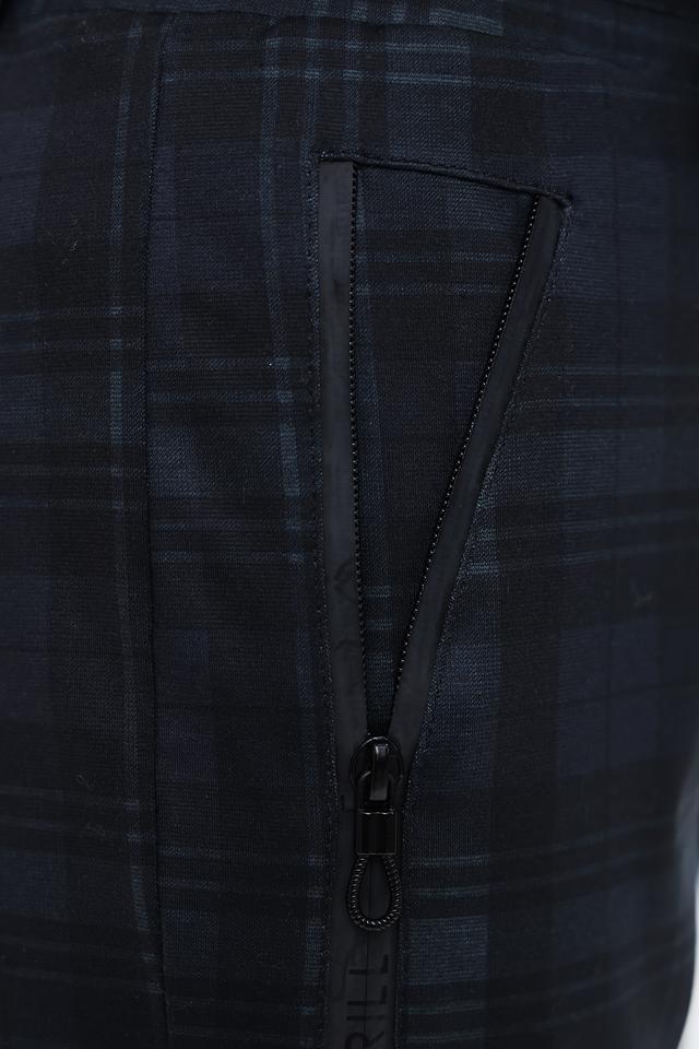 Брюки выполнены в тёмно-зелёном и чёрном цвете с клетчатым принтом, что придает им современный и стильный вид. Они изготовлены из смеси полиэстера, вискозы и эластана, что обеспечивает мягкость, приятные тактильные ощущения и хорошую посадку по фигуре.