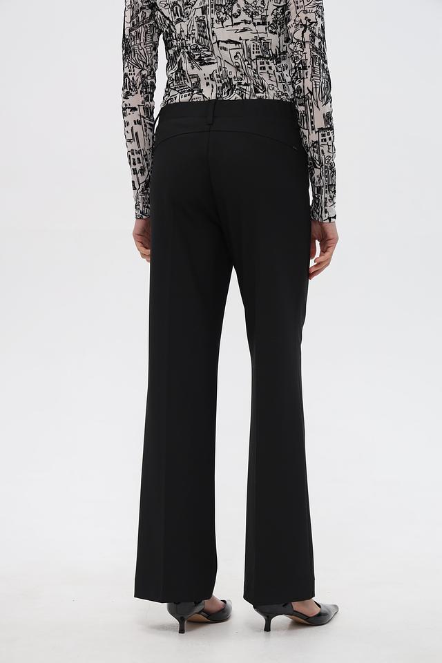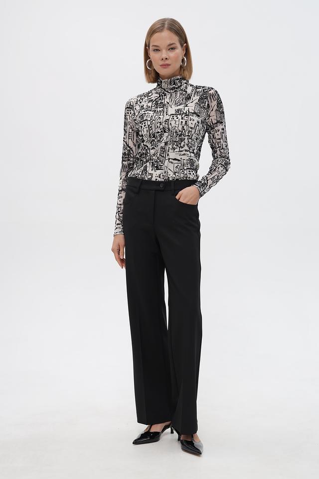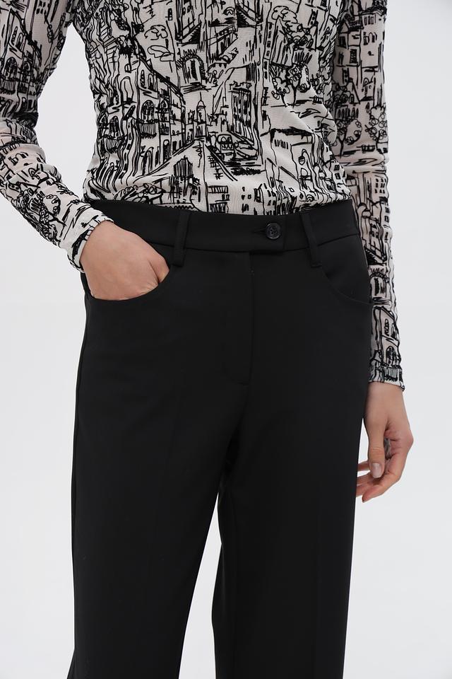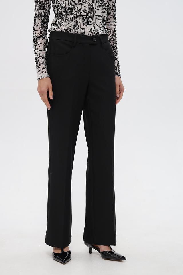 Брюки имеют высокую посадку и свободный крой в области бёдер, плавно расширяющиеся к низу. Застёжка на молнию и пуговицу, а также наличие боковых и задних карманов делают их практичными в носке.